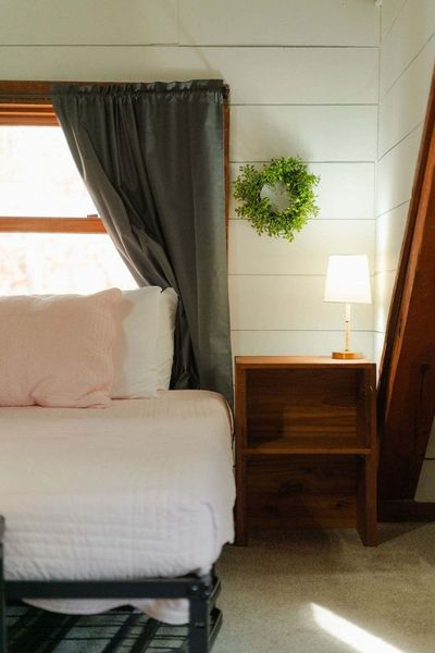 This beautiful cabin accommodates 7 guests in 2 bedrooms, with a sleeping area in the loft that overlooks the living room. The primary bedroom is fitted with a king-size bed and large closet. The secondary bedroom is fitted with a queen bed and a closet. Lastly, the loft overlooking the living room, serves as a sleeping area with a full bed and pull-out single bed. As well as a hang out spot, for kids enjoying the Paceman arcade game!