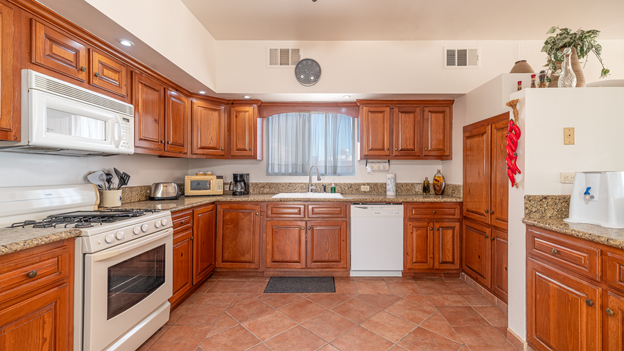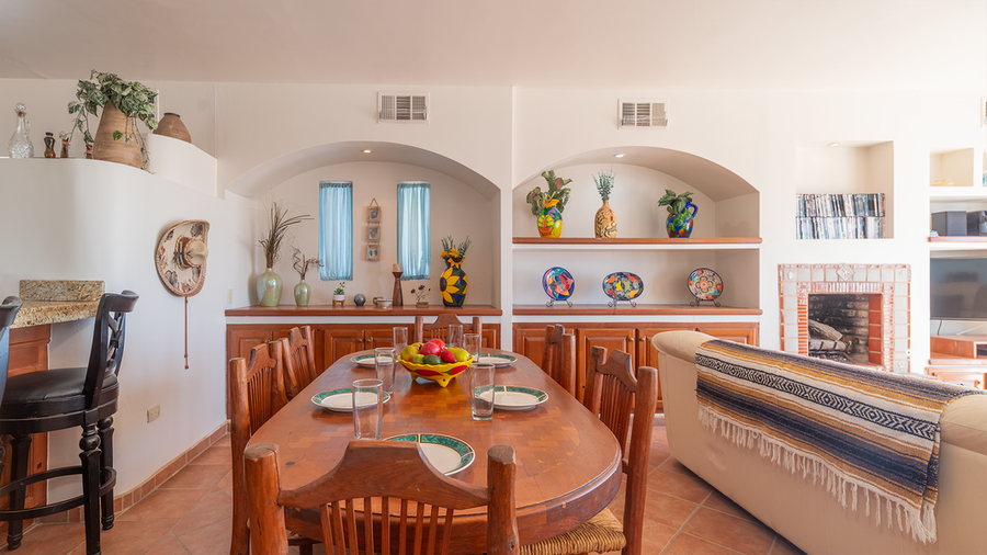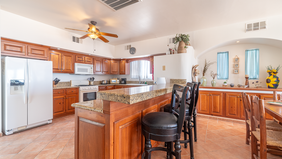 Tile work is used in many parts of the house, and can be appreciated in the main room. This room is quite large, flowing into the kitchen past the large kitchen counter, set with bar stools. Furnishings and design details bring a relaxed, open, and very Mexican touch to this terrific living space. For entertainment there is a TV and DVD player. The kitchen is big, and welcomes those who like to cook! Wooden cabinets, and all appliances, utensils, and cooking things big and small can be found here.,