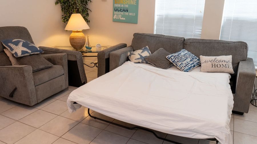 The master bedroom has a decent queen bed, with en suite full bathroom and a flat screen TV to wind down if your kiddos go to sleep out in the living room on the sleeper sofa that is a full sized bed. We do provide an airbed & pump just in case you need separate beds. Please do bring bedding and pillows if you plan on using the pull out or airbed :)