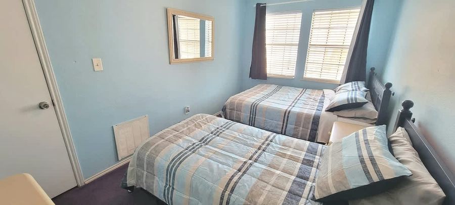 Three full bedrooms. Upstairs master bedroom has queen bed. 2nd bedroom upstairs has 2 single beds. Third bedroom downstairs is converted garage in very large with 2 queen beds. Up to 10 people allowed. Great deal!