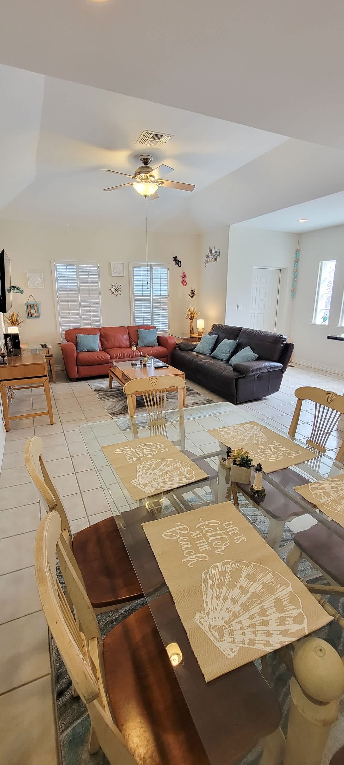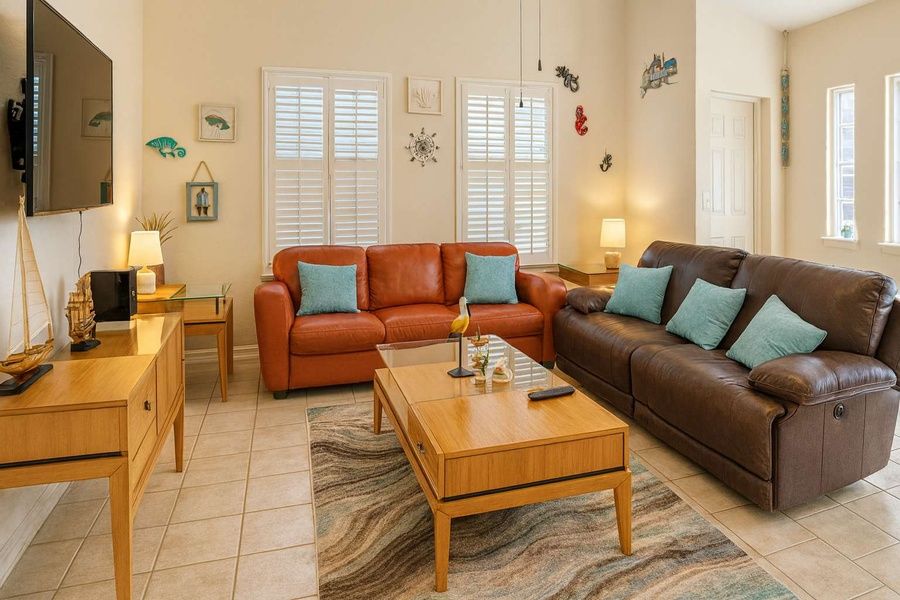You will enjoy the open concept kitchen that flows to the 6 person dining table as well as the large couches for family movies after a long day at the beach