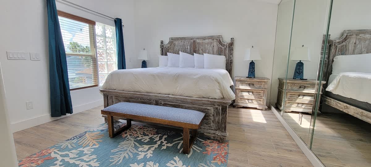 Upstairs on second floor is the kitchen, living room, a stand alone full bathroom, and the master bedroom with it's own massive bathroom and walk in closet. Unique to this home, the master bedroom has a king bed, and a "nook" with a bunk bed that is actually "queen over queen" sized beds, which great for mom & dads with small kids that may want to stay close.