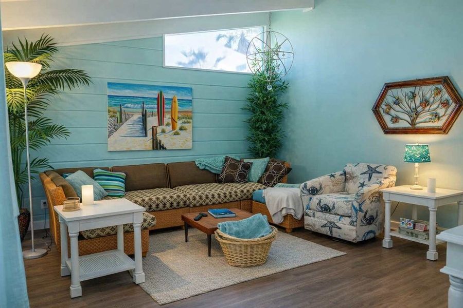 Little Caribbean Vibes affords a cool, clean, and vibrant spot with its colors & décor. It is elevated about 12 feet up on piers, there's a shaded chill-out space under the home to enjoy a margarita and relax after a long beach day that is shared with the back 3 bedroom, or the private front deck with a couple of chairs to watch the passersby.