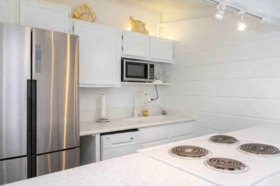This is the front unit with a kitchen and bathroom. Kitchen is fully equipped for you to make easy breakfast tacos to your house recipe vacation nachos! Just so you know, each unit in the duplex is private and stand-alone; the back unit is a separate 3-bedroom, 2-bath space.