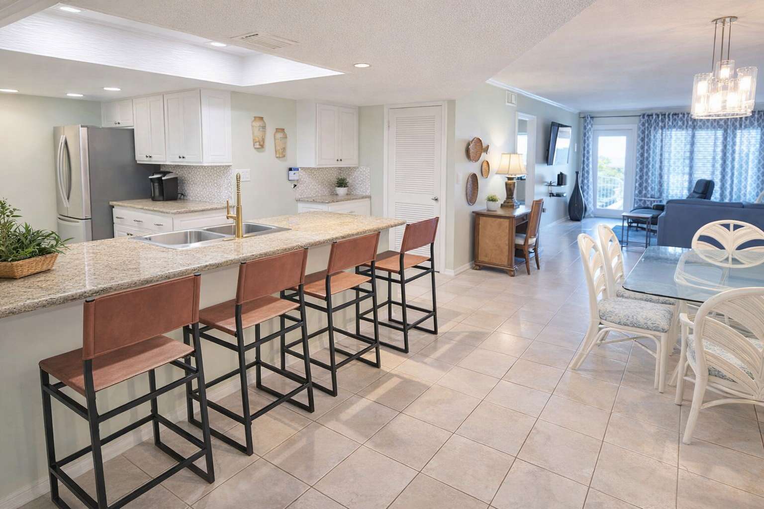 Each bedroom has a flat screen, plus the living room has a brand new 65 inch HD smart TV wall mounted. The open concept kitchen flows right to the dining and living area for hanging out. Right out the patio door is a nice sized balcony with a rare gas grill. (note we don't provide gas bring a LP tank)