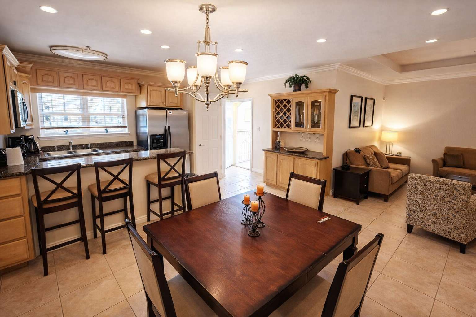 Comes with a fully equipped kitchen that is smaller but with all pots & pans, towels, and linens + basic soaps. Great 2nd story private patio overlooks the pool in back if you want to watch the kids swim or sip a margarita