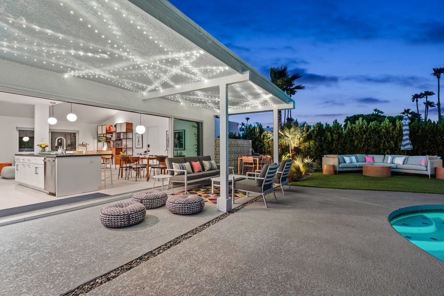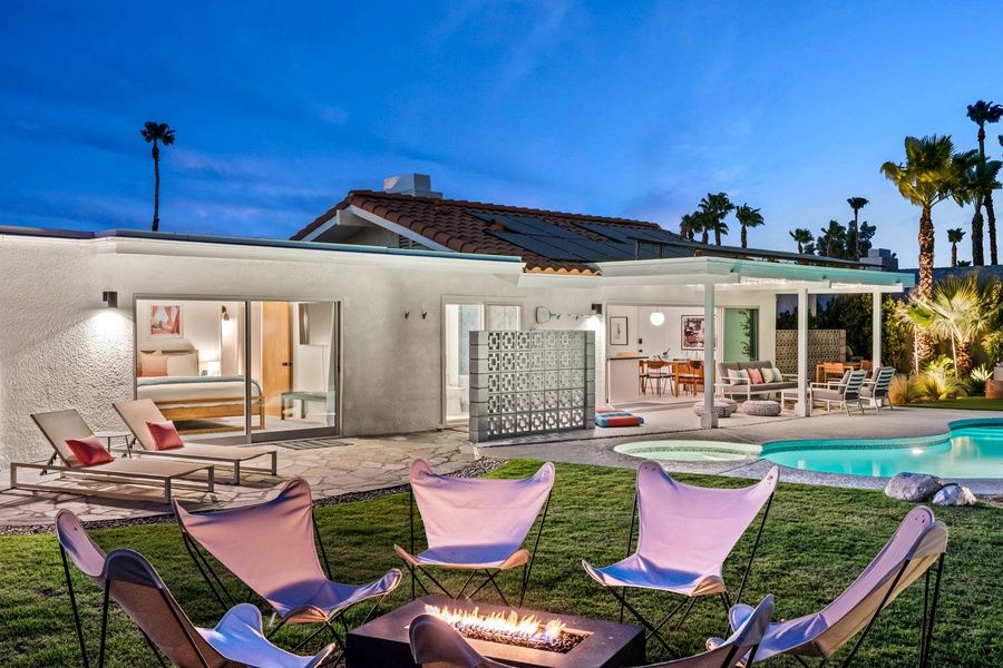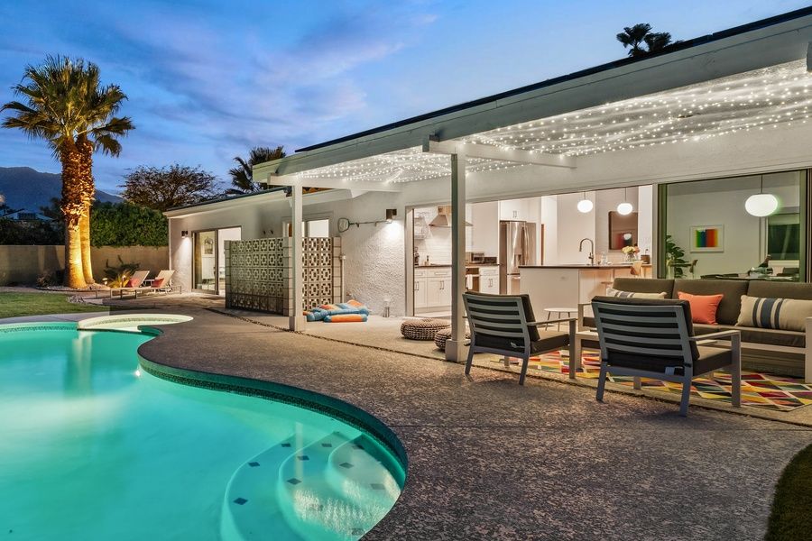 PS CITY ID #064114 Designed by Hugh Kaptur, a pioneer of Palm Springs desert modernism, this mid-century showpiece channels the romance of a Greek island escape. Whitewashed stucco and sharp modern lines glow under the desert sun, palms frame a shimmering pool, and mountains rise like distant Aegean calderas. Spend your days lingering over taverna-style brunches, drifting in the water, and sipping starlit cocktails beside bougainvillea—your own private island, reimagined in the desert. Highlights • Dog-Friendly, Fully Fenced Yard – Let your pup roam while you sip a cocktail in the shade. • Heated Private Pool – Perfect for sunrise swims or evening dips under desert stars. • Remodeled Kitchen & Baths – Cook in style and unwind in spa-like comfort. • 2-Car Garage + Laundry – Park with ease, pack light, and stay fresh all trip long. • Multiple Outdoor Lounges – Sunbathe, dine al fresco, or toast the mountains at sunset. The Space This single-level retreat blends Hugh Kaptur's desert modernism with breezy Greek island charm. Sunlight fills the open layout, connecting the bright living room, dining area, and a remodeled kitchen with stainless steel appliances, sleek cabinetry, and modern finishes. A full wall of retractable sliding glass doors erases the line between indoors and out, bringing citrus blossoms, pool shimmer, and mountain views right into the heart of the home. Sleeping Arrangements • Primary Bedroom: King bed, updated en-suite bathroom with dual sinks and walk-in shower, with extra large sliding glass doors to a flagstone patio and mountain views • Bedroom 2: King bed with its own private patio • Bedroom 3: Two Twin beds • Hallway Bathroom: Updated tile throughout with full-size bathtub Outdoor Living Step outside and sink into your own private desert sanctuary. The sparkling pool catches the sunlight by day (and can optionally be heated for year-round swims), framed by Mediterranean landscaping and a pet-friendly turf lawn. Curl up on the full-size outdoor daybed for an afternoon nap, or claim a shady seat under the covered patio for cocktails and conversation. As the sun sets, gather around the built-in fire pit and watch the desert sky spill over with stars. Location Minutes from the chic Uptown Design District, this tranquil Vista Norte retreat puts designer boutiques, art galleries, fine dining, and downtown Palm Springs' nightlife right at your fingertips—along with quick escapes to hiking trails and sweeping desert views. Pool Heat Ensure a comfortable swim with optional pool heating, available upon request at booking or before your arrival. The pool is heated to 87º from 7 AM to 7 PM throughout your stay. Rates vary by season: November–March: $75/night and April, May, October: $50/night. Heat is not needed in other months not listed. For stays under 5 nights, pool heat must be purchased for the entire stay—unfortunately we cannot heat it for select days. A 24-hour notice prior to arrival is required to ensure optimal warmth on your first night. Heating begins the day before your arrival at no extra charge. Hot Tub Unwind in the elegance of your private hot tub, heated instantly at the touch of a remote. There's no preheating required, no added charge, and no schedule but your own. From crisp desert mornings to velvety starlit nights, immerse yourself in the warm, effervescent waters and let the stillness of the desert frame each perfect moment. Summer Utility Surcharge For stays of 29 nights or longer between June 1st and September 31st, a $750/month utility surcharge will apply to help cover the additional energy costs associated with cooling the home during the summer heat. Additional Policies & Rules • No outdoor music. Doors must be closed if playing music within the house. • 100% quiet hours outside from 10pm-10am • No smoking inside home • Renter must be 25+ years of age • Guests will sign a Ryson "Terms and Conditions" form and City Ordinances require a copy of your ID to Ryson prior to the day of your arrival. Ryson Vacations has engaged VacayHome to ensure this listing contains all the information you need and that it is easy for you to book via search engines & online channels. VacayHome is connected directly to the property management system used by Ryson Vacations which ensures that availability & rates are up-to-date & accurate. When you book, VacayHome processes payment on behalf of Ryson Vacations and a charge will appear on your statement as "VacayHome". VacayHome will send you a confirmation e-mail that contains all the information you need to prepare for your vacation including arrival instructions. VacayHome has a 24 x 7 team to assist you with any questions or concerns you may have prior to arrival. To access VacayHome, obtain the customer support telephone number or read FAQs, please click on the links at the bottom of this page.