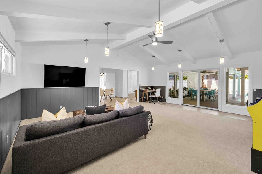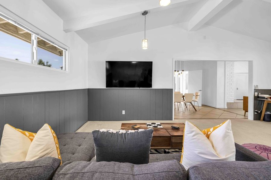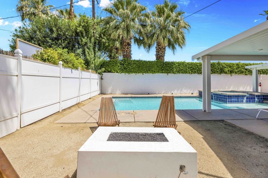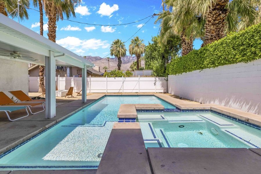 PS CITY ID #069052 Soak up the quintessential Palm Springs lifestyle at this mid-century modern gem in South Palm Springs. Located on a quiet cul-de-sac in the sought-after Los Compadres neighborhood, this stylish 3-bedroom retreat boasts a spacious corner lot, breathtaking mountain views, and outdoor spaces designed for laid-back desert living. Highlights -Iconic San Jacinto mountain backdrop -Private pool, spa + fire pit -EV charging station -Vaulted ceilings + multiple lounge areas -Lush palm-lined, wraparound yard -Zoned HVAC for maximum comfort -Prime location near dining + shopping The Space Step into a light-filled, open-concept home with vaulted ceilings and expansive living areas that flow seamlessly into one another. The living room and bonus media room offer plenty of space to gather, stream your favorite shows, or simply relax. Mid-century design details complement modern upgrades throughout, creating a fresh yet timeless vibe. The large chef-style kitchen comes fully equipped with modern appliances, ample prep space, and seating for easy group meals and conversation. Sleeping Arrangements Primary Suite: King bed, en suite bath with dual sinks, large closets, patio access Guest Room 1: Queen bed, access to hallway bath Guest Room 2: Queen bed, access to hallway bath (All bedrooms include premium mattresses, stylish décor, and generous storage.) Outdoor Living The expansive, wraparound yard is fully enclosed with lush ficus and palm trees for ultimate privacy. Enjoy pool days with unbeatable views of Mt. San Jacinto, unwind in the hot tub at sunset, or gather around the built-in fire pit for evening cocktails. A covered patio provides shaded outdoor dining and lounge areas for year-round entertaining. Location Tucked away in the peaceful Los Compadres neighborhood, this home is just minutes from Historic Hwy 111 and a quick drive to the heart of downtown Palm Springs. You'll find top-rated restaurants, trendy shops, golf courses, and desert trails all within easy reach. Pool Heat Ensure a comfortable swim with optional pool heating, available upon request at booking or before your arrival. The pool is heated to 87º from 7 AM to 7 PM throughout your stay. Rates vary by season: November–March: $75/night and April, May, October: $50/night. Heat is not needed in other months not listed. For stays under 5 nights, pool heat must be purchased for the entire stay—unfortunately we cannot heat it for select days. A 24-hour notice prior to arrival is required to ensure optimal warmth on your first night. Heating begins the day before your arrival at no extra charge. Hot Tub Indulge in the ultimate relaxation with our hot tub, conveniently heated at your fingertips using a remote control. Please note that the hot tub is not pre-heated before arrival, but worry not—there's no extra charge (even if not opting for pool heat) to enjoy its warmth. Simply activate it whenever you desire, creating the perfect atmosphere for a soothing soak during your stay. Summer Utility Surcharge For stays of 29 nights or longer between June 1st and September 31st, a $500/month utility surcharge will apply to help cover the additional energy costs associated with cooling the home during the summer heat. Dog Fee Information (up to 2 dogs/stay) Stays between 2-20 nights, there is a $89/dog/stay fee. Stays of 21 nights or more, there is a $200/dog/stay fee. We ask that you pick up after your pet if they relieve themselves in the yard. Signs of extensive pet damage, could result in additional fees. Any signs of pets on the property without our knowledge will incur an additional $500 fee. Sorry not feline friendly. Additional Policies & Rules -No outdoor music. Doors must be closed if playing music within the house. -100% quiet hours outside from 10pm-10am -No smoking inside home -Renter must be 25+ years of age -Guests will sign a Ryson "Terms and Conditions" form and City Ordinances require a copy of your ID to Ryson prior to the day of your arrival. Ryson Vacations has engaged VacayHome to ensure this listing contains all the information you need and that it is easy for you to book via search engines & online channels. VacayHome is connected directly to the property management system used by Ryson Vacations which ensures that availability & rates are up-to-date & accurate. When you book, VacayHome processes payment on behalf of Ryson Vacations and a charge will appear on your statement as "VacayHome". VacayHome will send you a confirmation e-mail that contains all the information you need to prepare for your vacation including arrival instructions. VacayHome has a 24 x 7 team to assist you with any questions or concerns you may have prior to arrival. To access VacayHome, obtain the customer support telephone number or read FAQs, please click on the links at the bottom of this page.