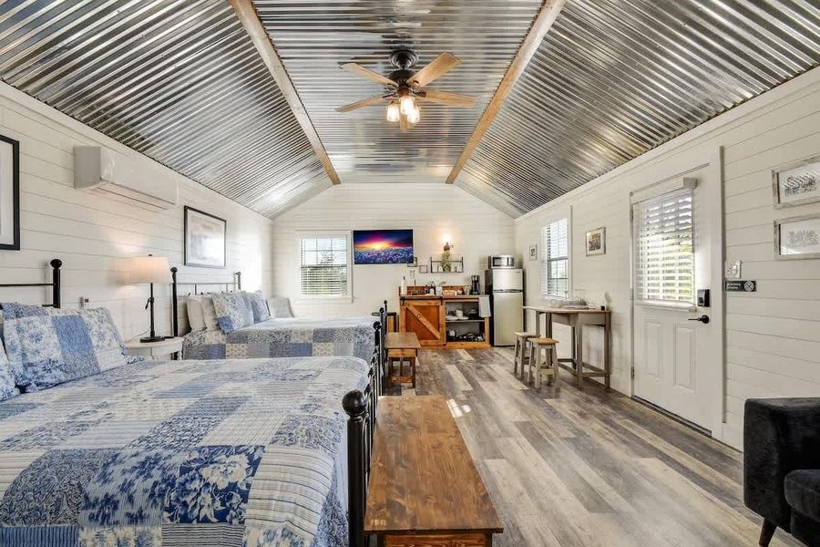Welcome to the Bonny Bluebonnets Cottage, a charming studio that is one of four nestled on 10 serene acres just a short 10-minute drive from downtown Fredericksburg. This quaint yet modern abode features two luxurious queen-sized beds. Embrace the communal spirit of the shared "Party Barn" gazebo, offering games like cornhole, a welcoming firepit, outdoor dining area, gas grills, amazing sunset views and an opportunity for star gazing. Your perfect blend of relaxation and socialization awaits. Nestled within the expansive landscapes of the Texas Hill Country, the Bonny Bluebonnets Cottage is a delightful home that offers a tranquil retreat with captivating countryside vistas and stunning sunset views. Located a mere 10-minute drive from the historic downtown area of Fredericksburg, this charming accommodation embodies an inviting farmhouse-style charm adorned with floral motifs, creating a warm and welcoming ambiance throughout. The interior decor exudes an attractive farmhouse aesthetic, with the Texas' state flower adorning virtually every wall, adding a touch of rustic elegance to the space. The kitchenette is equipped with modern amenities, an induction cooktop, a Keurig-style coffee maker, a microwave, an electric skillet, a toaster, and a stainless steel refrigerator. Pots, dishes, glassware, silverware, and cooking/grilling utensils are thoughtfully provided, ensuring that guests have everything required for meal preparation and dining convenience. The dining area, whether indoors or on the cottage's deck, offers a cozy setting to savor these culinary creations. Accommodations include two comfortable queen beds within the space, ensuring a restful and peaceful stay for guests. A walk-in closet and en-suite bathroom adds convenience and privacy, facilitating a comfortable retreat after a day of exploration. Entertainment options abound within the space, featuring high-speed Fiber Internet and a 50-inch smart TV for leisurely viewing, ensuring guests have access to their favorite shows or movies during their stay. Stepping outside, a scenic path leads to the gazebo, affectionately known as the "Party Barn," serving as an inviting outdoor hub for social gatherings and enjoyment. This charming space is well-equipped with an outdoor dining table, ideal for communal meals amidst the picturesque surroundings. Additionally, guests can indulge in outdoor culinary adventures using the two gas grills available. A gas fire pit provides a cozy ambiance for evening relaxation, while the Cornhole game offers outdoor entertainment for guests of all ages. Ample seating arrangements around the gazebo allow for comfortable lounging, fostering an inviting atmosphere for gatherings of friends and family, encouraging relaxation and socializing against a backdrop of the stunning Hill Country landscape as well as amazing sunsets and starlit skies. *If you need to work during your stay, high-speed fiber optic Internet is available. Easy Check-In Process We use Happy Guest for a seamless, app-free check-in experience. Just complete your rental agreement, ID verification, and a simple refundable security hold of $1,000 (which is not a traditional security deposit, just a pending transaction) to receive your arrival instructions. If you'd prefer, you can opt for a Non-Refundable Damage Waiver instead, which provides coverage up to $1,500. The waiver is $53 for stays up to 10 nights, with an additional $1.50 per day for stays longer than 10 nights. It’s simple: finish these steps, and you’re all set to enjoy your stay! Note: arrival info won’t be sent without completing these steps, and refunds aren’t possible if skipped. Happy Guest is web-based and user-friendly, with all the info about the house and local spots. You can even share it with friends and family. Got questions? Just message us anytime! Stay Texas has engaged VacayHome to ensure this listing contains all the information you need and that it is easy for you to book via search engines & online channels. VacayHome is connected directly to the property management system used by Stay Texas which ensures that availability & rates are up-to-date & accurate. When you book, VacayHome processes payment on behalf of Stay Texas and a charge will appear on your statement as "VacayHome". VacayHome will send you a confirmation e-mail that contains all the information you need to prepare for your vacation including arrival instructions. VacayHome has a 24 x 7 team to assist you with any questions or concerns you may have prior to arrival. To access VacayHome, obtain the customer support telephone number or read FAQs, please click on the links at the bottom of this page.