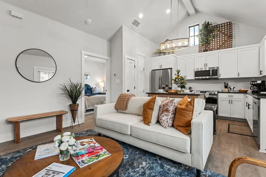 Step into this stylish and chic retreat boasting an open layout that seamlessly connects the living space, kitchen, and dining area. The living area is a haven for relaxation and entertainment – sink into the plush comfort of the cozy couch or take a seat in the additional chair. The flat-screen TV takes center stage, providing the perfect focal point for movie nights or catching up on your favorite shows.