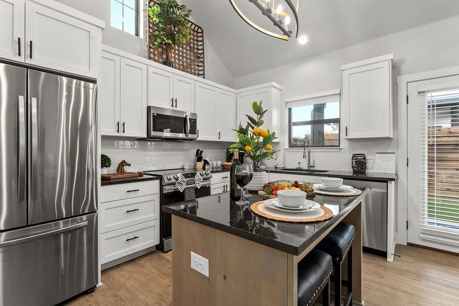 The kitchen is a culinary haven, equipped with stainless steel appliances that cater to your every cooking need. The island, complete with bar seating for two, is ideal for quick breakfasts or casual conversations over a glass of wine while preparing meals. Whether you're a seasoned chef or just looking to whip up simple dishes, this kitchen has you covered.