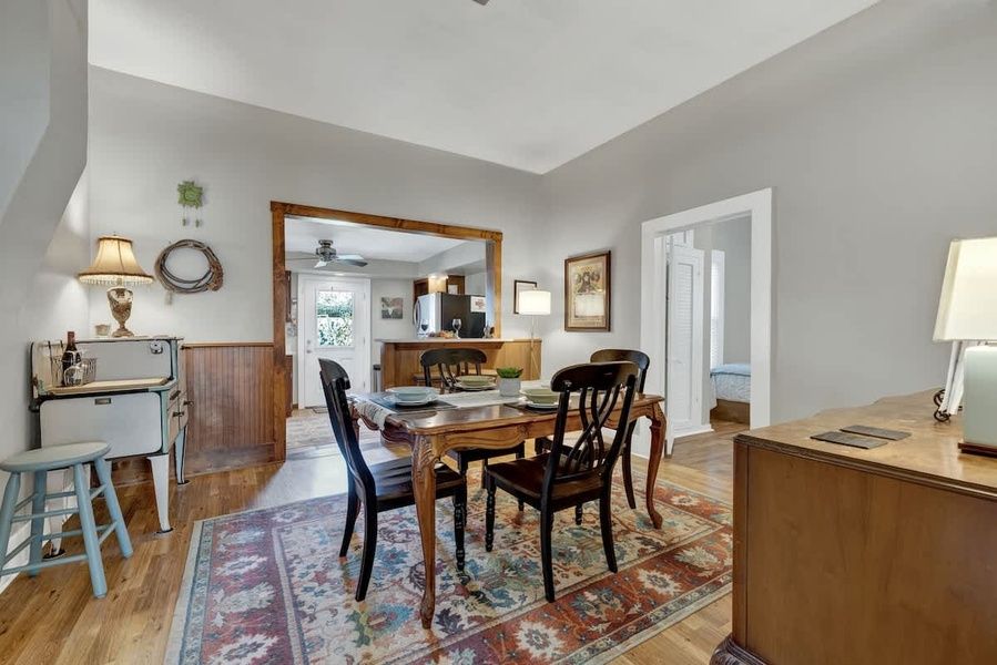 Austin Haus exudes comfort and relaxation. The bright and inviting living room welcomes guests with its spacious layout, boasting plush seating that invites relaxation and a flat-screen TV, perfect for entertainment and unwinding after a day of exploration. The airy dining room, accommodating four guests, offers a cozy space for shared meals, while two additional bar seats at the kitchen counter provide a casual spot for quick bites or morning coffee.