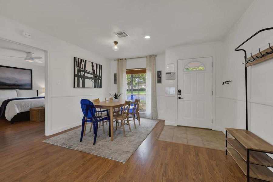 The front facade of Glenmoor Abode is classic brick with a very homey feel. The living space creates plenty of seating with a stylish sofa and sitting chairs in front of the large flatscreen TV. This living space is a great place to kick back with a bottle of wine and socialize or have a bowl of popcorn and a great movie.