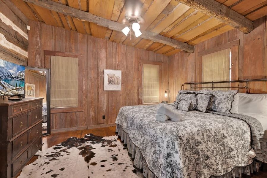 The bedroom is designed to be a haven of comfort and tranquility. It features a spacious and comfortable king-sized bed, ensuring a restful night's sleep. The room is tastefully appointed with furnishings that complement the cabin's rustic charm. Adjacent to the bedroom is a full bathroom, providing convenience and privacy for guests.