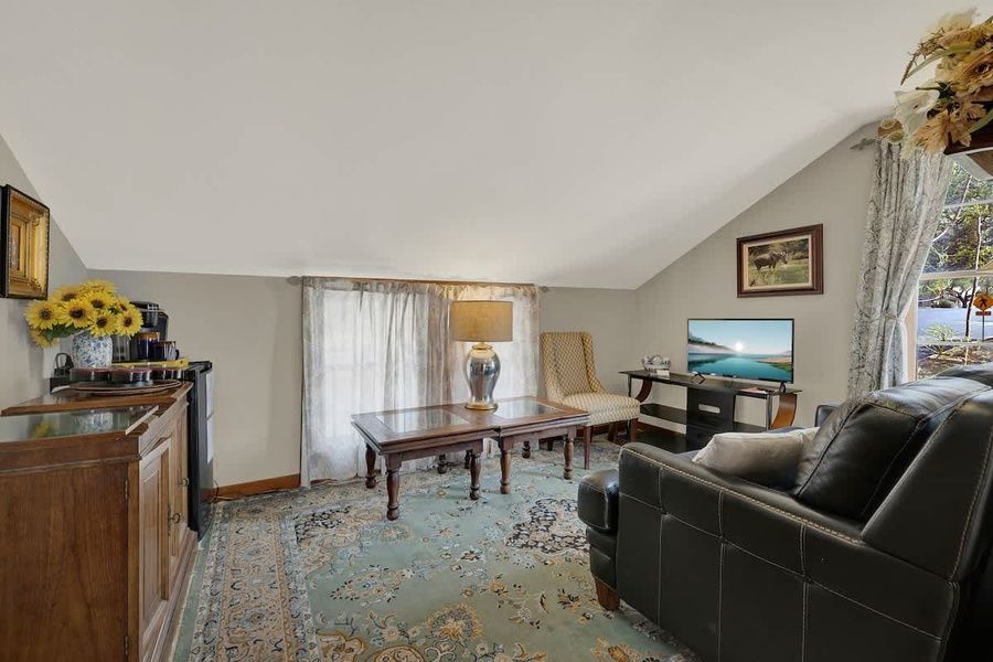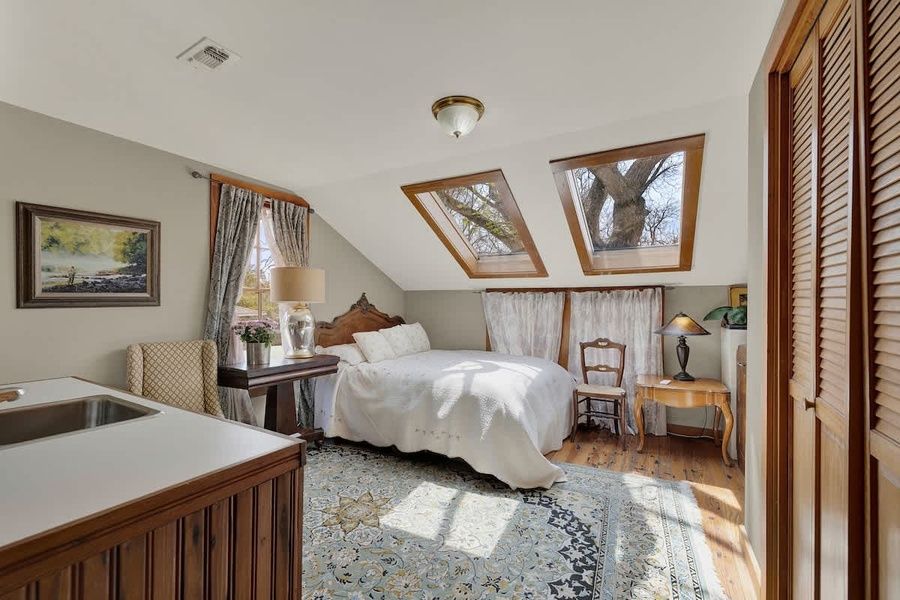 This charming retreat features a cozy queen-size bed, inviting you to unwind in an atmosphere of timeless elegance. The ensuite bathroom offers a luxurious jacuzzi tub—perfect for soaking after a day of exploring. Guests can also enjoy the shared spaces of the home, including a bright and airy parlor with a wood-burning fireplace and a living room impeccably decorated with period antiques. Relax on the covered porch, where rocking chairs invite you to savor a quiet morning coffee or an evening glass of wine. With the owners living on-site, you’ll experience warm hospitality in this truly special home.