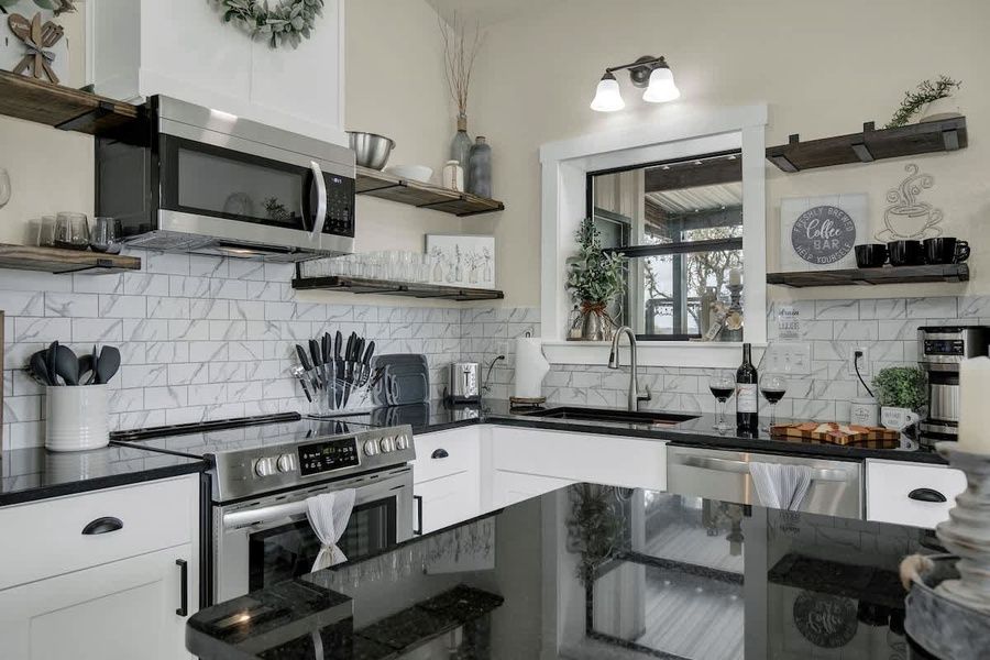One of the many appealing aspects of Fritz's Hill Country Hideaway is its kitchen’s appointment of quality appliances and dinnerware. This kitchen comes stocked with a full complement of plate ware, flatware, serving platters, glassware, wine glasses, and many other little necessities for those wishing to cook or dine in. Outside of the kitchen, there’s also an inviting covered patio area with a hot tub, outdoor furniture for relaxing and eating. Fritz's Hill Country Hideaway is certain to be a much-loved attraction for cooks and foodies alike!