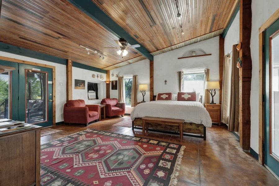 Sonora Casita is a unique retreat, built from hay bales and stucco, and adorned with Southwestern décor. Inside, you'll find a combined bedroom and sitting area, a well-equipped kitchen, and a sleek walk-in shower. The plush king-size bed ensures a restful night's sleep, while the private patio and hot tub provide a tranquil space to unwind and soak in the peaceful surroundings.