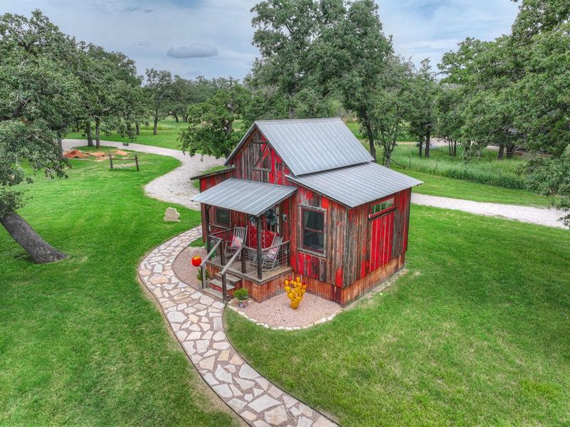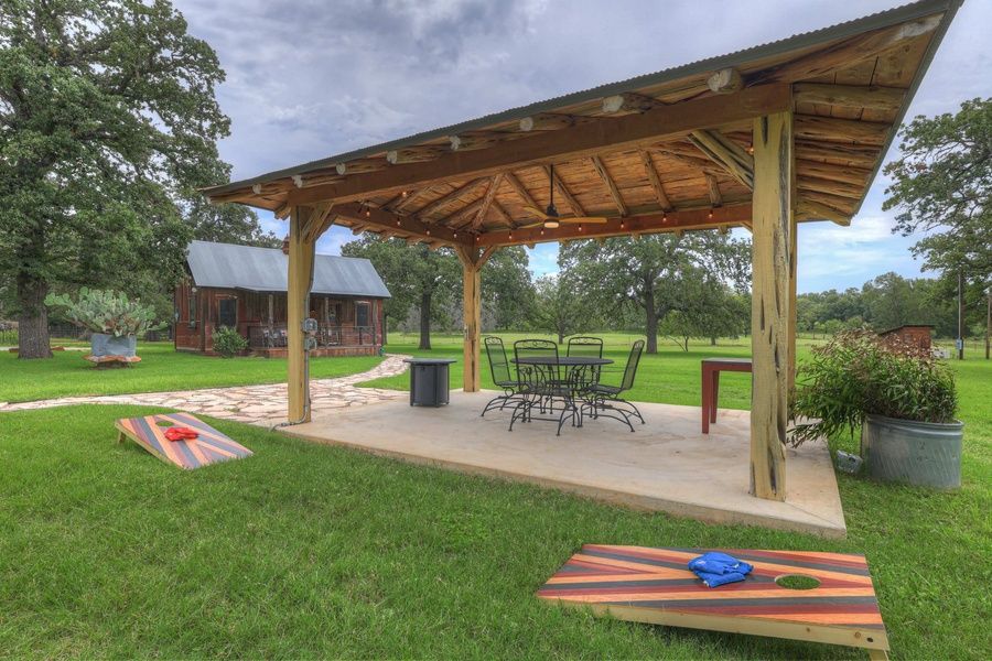 Step outside and enjoy the shared gazebo area, complete with a table and chairs, a cozy fire table, and a fun cornhole game—perfect for enjoying the fresh Hill Country air under the stars.