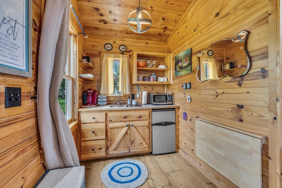 Inside, you’ll find a warm, inviting space featuring a king-size bed, a small dining table for two, and a well-equipped kitchenette with a mini fridge, microwave, sink, toaster, and Keurig—everything you need for a comfortable and convenient stay. The bathroom offers a soothing jacuzzi tub/shower combo, ideal for unwinding after a day of wine tasting or shopping on Main Street.