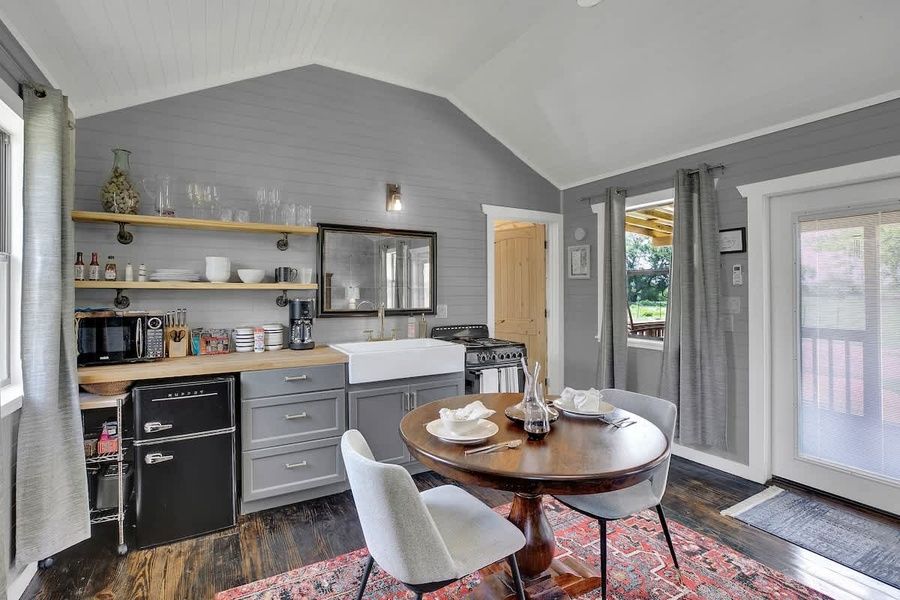 Elm Cottage is a luxury studio with a king bed that features a farmhouse kitchen, dining table for two, a SmartTV, and a private full bath with a walk-in shower and elegant farmhouse soaking tub. Additionally, the cottage has a great outdoor deck and patio perfect for your morning coffee or your evening glass of wine or cocktail.