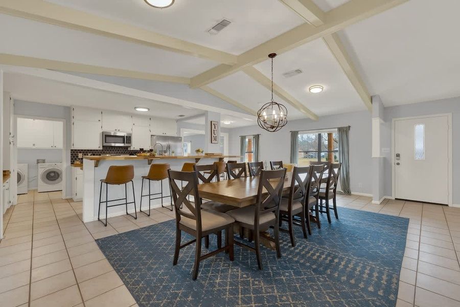 The South-wing of the house boasts an open living room, laundry room, and primary bedroom with a large closet and en-suite bathroom featuring a spacious walk-in shower and double vanity. The upstairs portion of the home is accessible from this side of the house. Both kids and adults will love hanging out upstairs playing pool, board games, or watching tv. There is also a bedroom with two twin beds and a bathroom with a stand-up shower available upstairs. The middle portion of the home is where you will find the full kitchen, formal dining area, and sunroom.