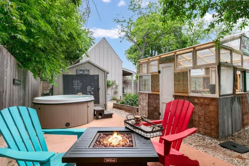 Step outside to your private hot tub, where you can soak under the stars, or gather around the firepit with Adirondack chairs, perfect for cozy evenings. Adding to the unique appeal of the property, the owner’s working greenhouse and raised bed garden create a picturesque and serene backyard setting.