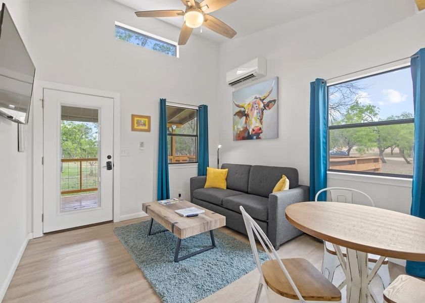 Guests at the Bluebonnet Cottage can take advantage of the riverfront location, indulging in activities such as kayaking or floating on the peaceful waters of the Pedernales River. The property offers a large covered pavilion, providing a gathering space furnished with comfortable seating and a convenient bathroom. Additionally, the pavilion boasts a backdrop wall ideal for capturing memorable photos to share on social media platforms.