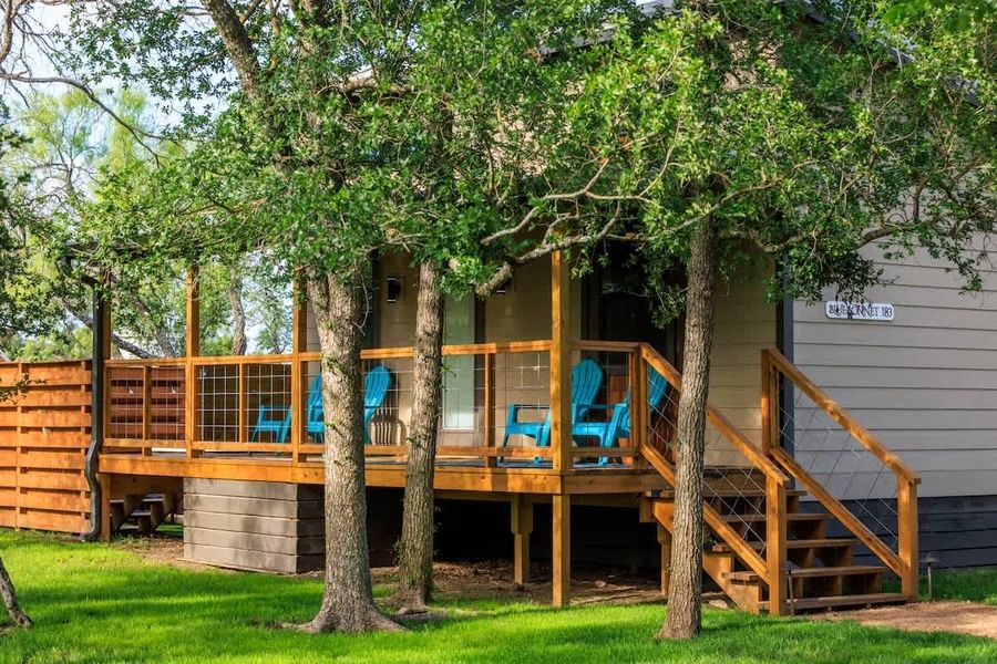 Nestled amid the serene landscapes of the Texas Hill Country and situated along the spring-fed Pedernales River, the Bluebonnet Cottage stands as one of six charming accommodations on the property. Its architecture boasts vaulted ceilings and a large front porch, inviting guests to unwind in a tranquil environment.