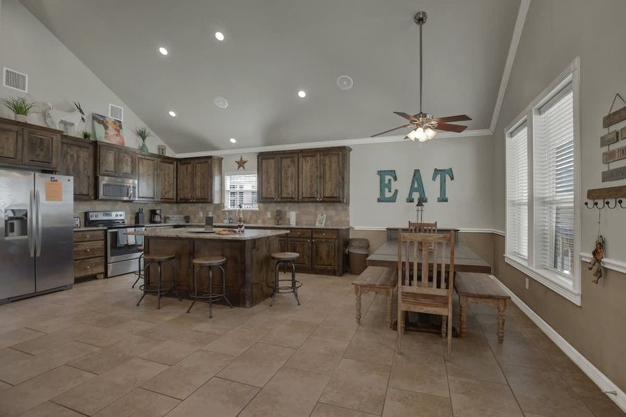 As you ascend to the second floor, you'll be greeted by the heart of the home—a spacious living room bathed in natural light. Sink into one of the two cozy sectional sofas and unwind after a day of adventure. The open concept design seamlessly connects the living room to the dining area, where a table for six invites you to gather for shared meals and conversation. The adjacent full kitchen boasts stainless steel appliances and a large kitchen island with bar seating for three, offering the perfect space for culinary delights and casual dining. Step outside onto the deck, where ample seating and a table provide the ideal setting for alfresco dining with a breathtaking view of the river.