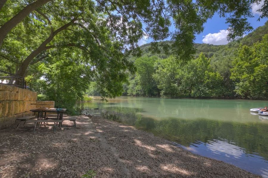 Step outside to the lower level patio space, where shaded picnic seating and a grill await. Just a one-minute walk from the Guadalupe River, this peaceful waterfront setting offers the perfect spot for picnics, relaxation, and outdoor enjoyment.