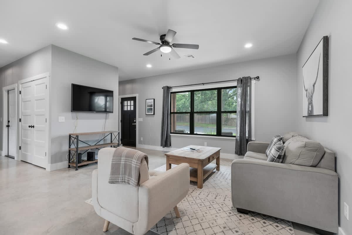 Welcome to the Wanderlust Haus! This Stunning and Modern Home is a three-bedroom, two-bathroom brand new home that is just 3 blocks from Main St. The Wanderlust kitchen, dining, and living room are open-concept and the fully functional kitchen displays beautiful white granite countertops and stainless-steel appliances. It is the perfect gathering space! The master bathroom includes a large walk-in tile shower while the guest bathroom includes a tub/shower combination. The fully functional kitchen displays beautiful white granite countertops and brand-new appliances including a Keurig coffee maker with complimentary coffee and creamer pods. The kitchen, dining, and living area are an open concept that allows for the perfect gathering space. This beautiful home has a gorgeous and large back porch and patio. You'll love sitting on the blue chairs on the back patio under the Texas stars!