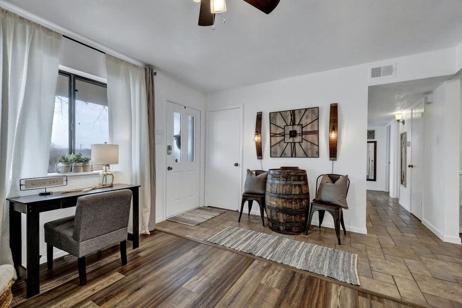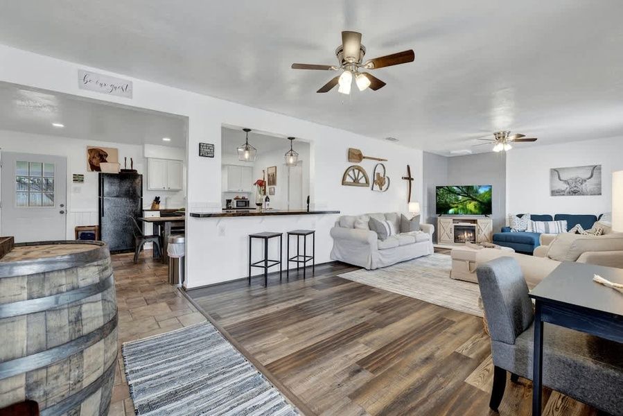 Bayer Guest Haus is a luxurious and spacious home that accommodates up to 8 guests comfortably. The inviting open living room, adorned with plush couches and a touch of charming farmhouse decor, features brand new wood floors and a large flat-screen TV—an ideal setting for unwinding and enjoying cozy movie nights with cherished loved ones.