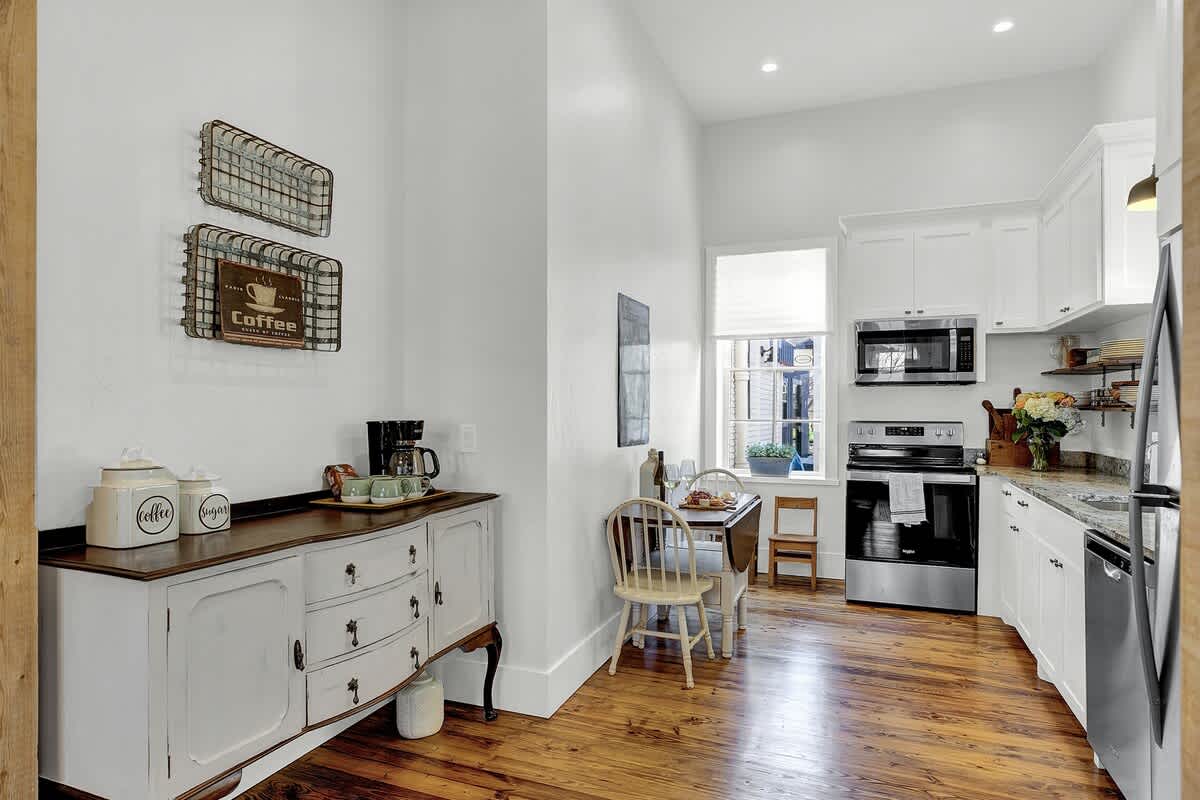 The Main House is private and has four bedrooms (two kings, one queen and two twins), three spa-inspired marble and granite baths, a large kitchen-dining room-living room, and two outdoor gathering spaces, including one with a fire pit. The 12-foot ceilings create an expansive feel to the home, but the highlight of this historic home has to be the private, underground, fully stocked wine cellar! The large driveway provides for four off-street parking spaces.