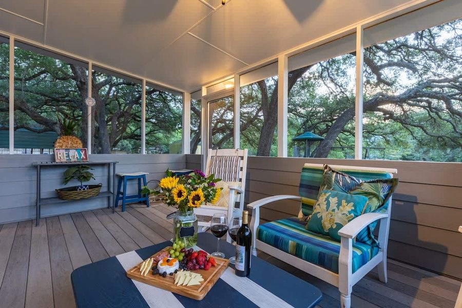 Soak in the fresh air in the screened-in patio on the main floor, or relax in the hammock under the shade of the mature trees. Enjoy a glass of wine or a s’more near the water on the tiled patio.