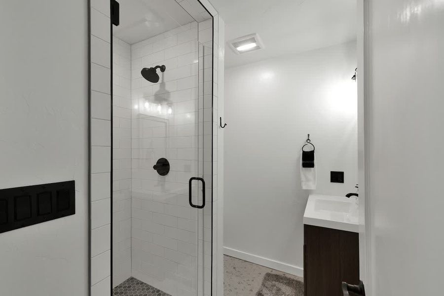 This thoughtfully designed retreat features a plush king bed, a sleek bathroom with a spacious walk-in shower, and all the essentials for a comfortable stay, including a microwave, coffee maker, and mini fridge.