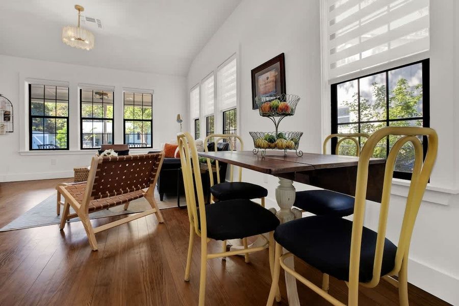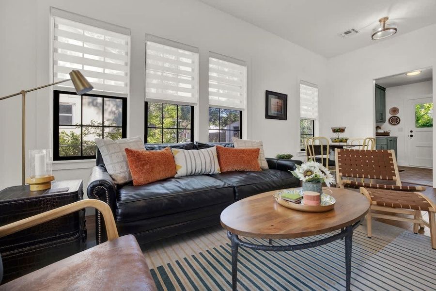 For moments of quiet contemplation or lively conversations, the front porch offers seating for two, providing a perfect spot to enjoy your morning coffee or unwind in the fresh air.