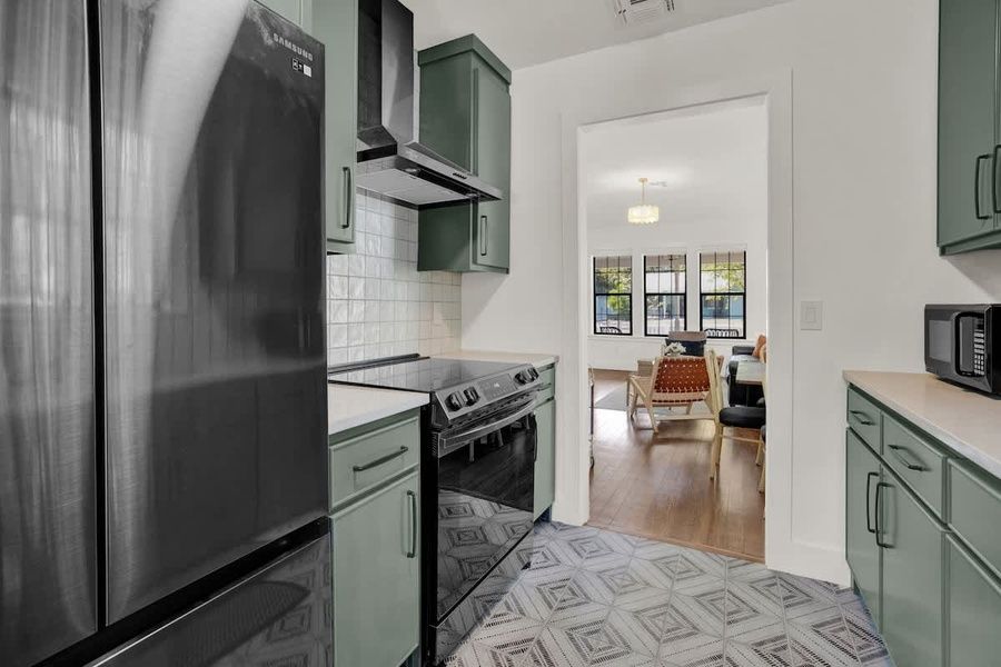 Step into a world of contemporary design and natural beauty with this stunning property. The beautiful modern living room, adorned with carefully curated decor, creates a welcoming space that seamlessly opens to a dining area featuring a chic table for four. This area flows effortlessly into a state-of-the-art kitchen, complete with stainless steel appliances that cater to the needs of both culinary enthusiasts and casual cooks.