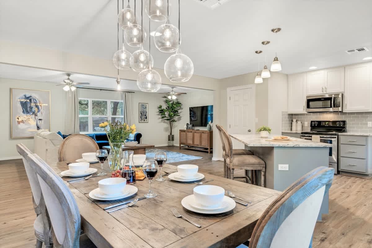 Welcome to beautiful and historic Fredericksburg! This Stunning and Modern Home is a three-bedroom, two-bathroom recently renovated home that is just a few minutes driving distance from Main St. The kitchen, dining, and living room are open-concept and the fully functional kitchen displays beautiful white granite countertops and stainless-steel appliances. It is the perfect gathering space! This beautiful home is the perfect place for families and friends as it will provide you everything you need to have a fantastic stay here in the Texas Hill Country!