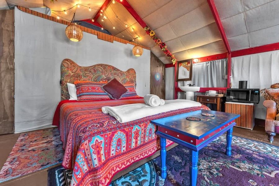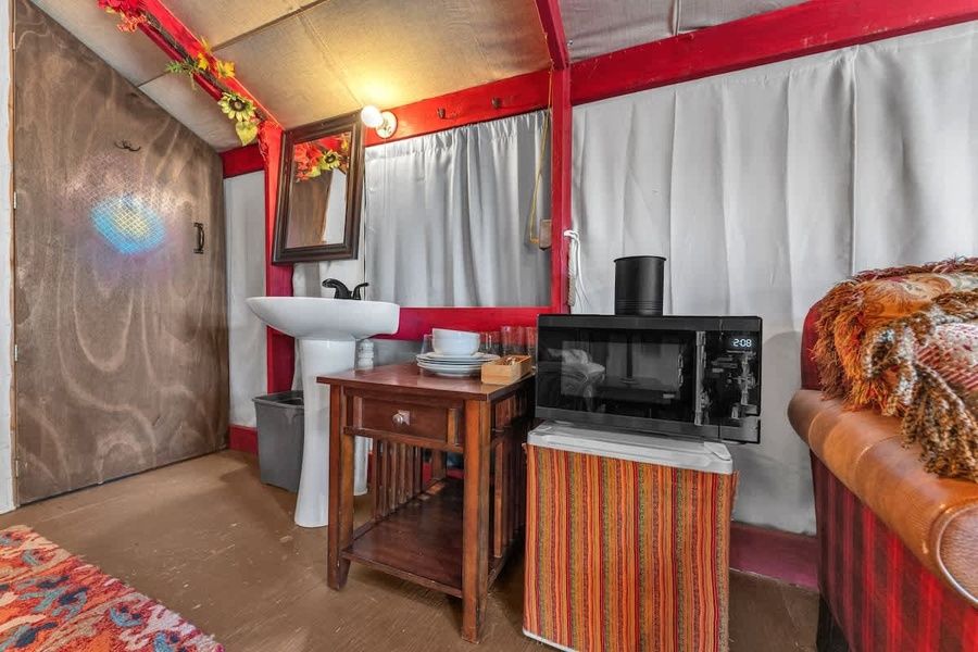 Escape to the perfect blend of comfort and charm just outside of Fredericksburg at this inviting retreat. The property features six thoughtfully designed cabins, surrounded by serene landscapes and natural beauty. The Bohemian cabin offers a cozy, stylish retreat with a unique bohemian-inspired décor. Large front windows invite natural light, allowing you to enjoy the morning sunrise from the king-sized bed, or close the curtains for a few extra hours of rest. Relax on the sofa, catching up on your favorite show or watching a movie before drifting off to sleep. There is a small area set up with a coffee pot, microwave, and mini fridge for convenience. Outside, unwind on the front deck in the two-person rocking chair, or enjoy a tranquil soak under the stars in the hot tub located on the side of the cabin. (Please note the hot-tub sits right next to the cabin and is not fenced so it is visible from the other cabins)