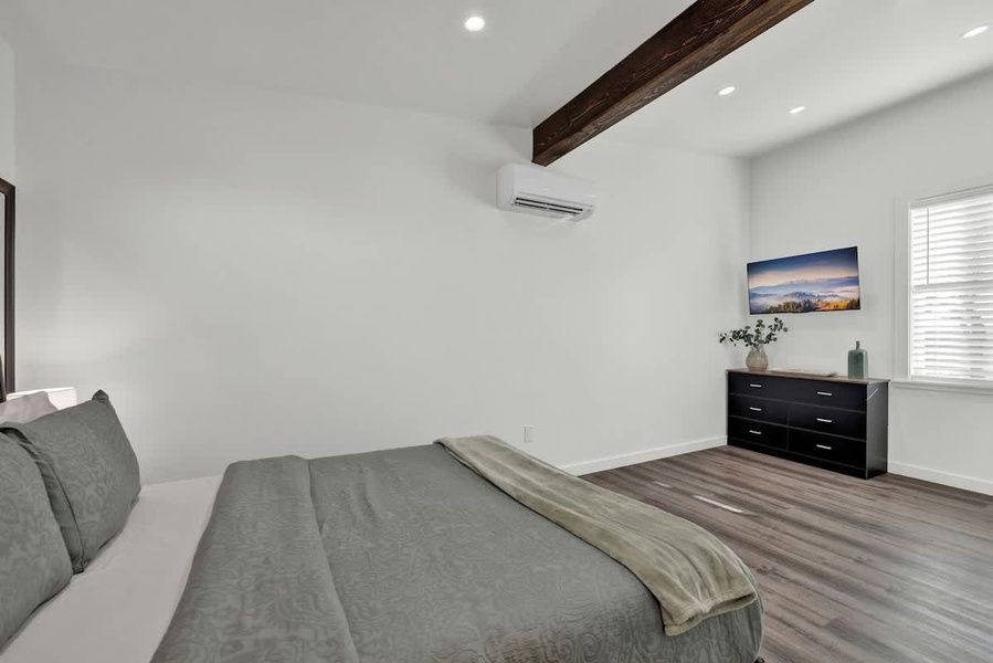 The open-concept layout of the guesthouse seamlessly connects the living area, full kitchen, and dining space, making it an ideal setting for both quiet evenings and lively conversations. Whether you’re preparing a gourmet meal or enjoying a leisurely breakfast, the well-equipped kitchen and cozy dining area set the stage for unforgettable moments.