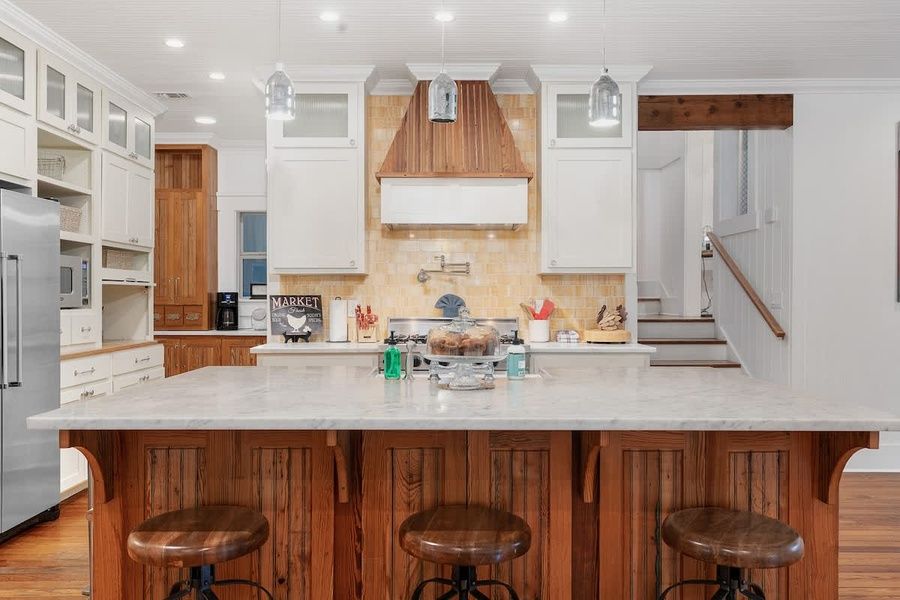 The fully-equipped kitchen boasts stainless steel appliances, including a gas stove, perfect for cooking large meals for the whole family or group. The kitchen also features a beautiful farmhouse sink, adding a touch of rustic charm to the space.