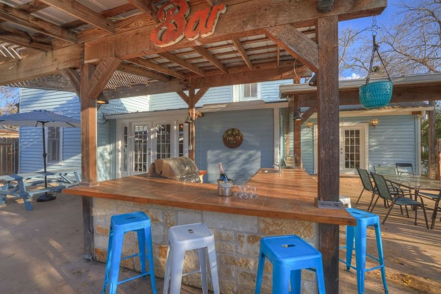 The outdoor area of the Crockett House is the ultimate space for relaxation and entertainment. The private backyard boasts a large pool (Can be heated during spring only for additional fee) surrounded by palm trees and a hot tub for up to six people, making it the perfect spot for relaxing and star gazing. The covered outdoor bar and kitchen are perfect for serving drinks, appetizers, and meals. Guests can enjoy dining under the covered pavilion or lounging on the outdoor lounge chairs.