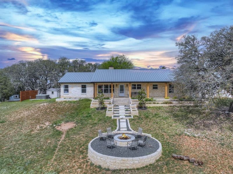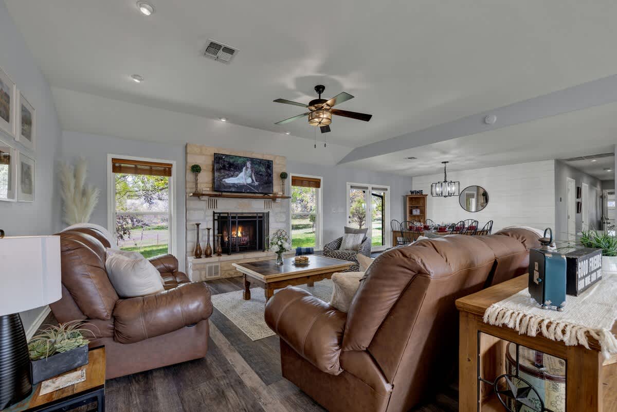 Nestled in the Texas Hill Country, just minutes from downtown Fredericksburg, this rustically elegant retreat offers stunning views and privacy. Relax in the hot tub or gather around the outdoor firepit for a cozy evening under the stars. Experience the beauty and tranquility of the Hill Country at this charming getaway.