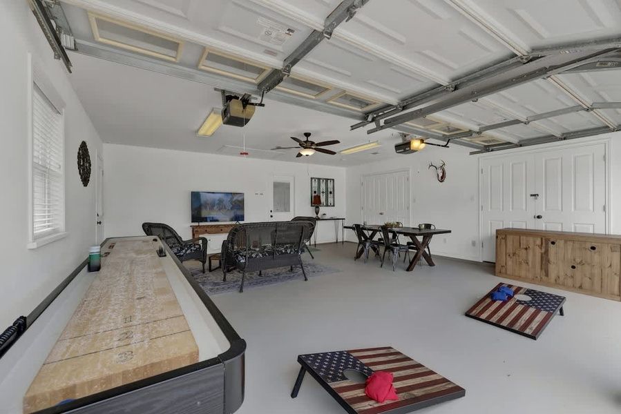 Prepare for hours of fun and excitement in the game room, located in the garage. Engage in friendly competition with shuffleboard, darts, and cornhole, or unwind with your favorite shows on the flat-screen TV. Ample seating for eight ensures everyone can join in on the fun.