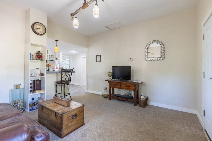 In summary, our property offers a cozy living room with a comfortable leather couch and a well-equipped kitchenette. The queen-size bed provides a peaceful retreat, and the full bathroom ensures convenience and comfort. The beautiful backyard space, with its firepit nestled under mature trees, invites you to relax and indulge in the peaceful surroundings. Whether you're seeking a quiet escape or a romantic getaway, our property provides the perfect space to unwind and create cherished memories.
