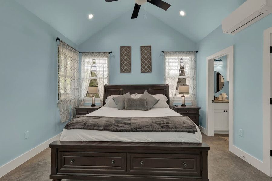 The bedroom features a plush king bed for a restful night’s sleep, and the bathroom includes a sleek walk-in shower for added comfort.
