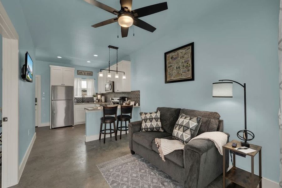 Inside, you’ll find everything you need for a comfortable stay. The full kitchen is outfitted with all the essentials for cooking, plus two barstools at the counter for casual dining. A cozy living area with a small sofa invites you to unwind with a glass of local wine after a day of exploring.