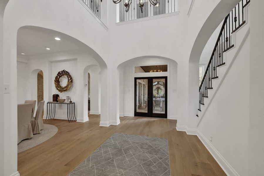 The living room, framed by stately columns and arches, is a masterpiece of design, featuring honey-colored floors and a striking limestone fireplace. This inviting space is ideal for intimate gatherings or quiet evenings by the fire. French doors open onto an expansive patio, leading you to the outdoor oasis. The luxurious master suite, just beyond a limestone archway, offers a king bed, a secluded desk workspace, and a lavish en-suite bathroom with a deep soaking tub, separate shower, and dual vanity for the ultimate in relaxation.