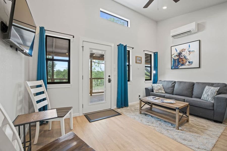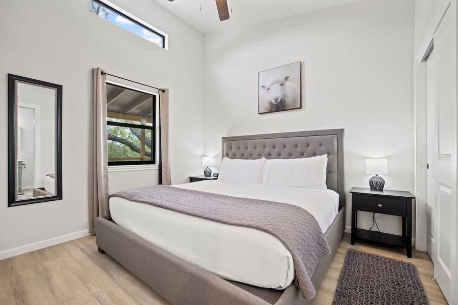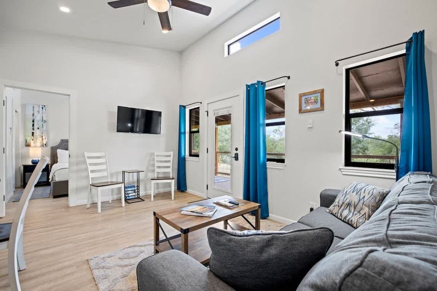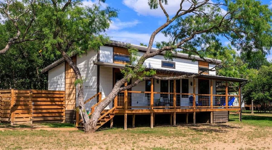 Nestled within the serene landscapes of the Texas Hill Country and resting alongside the spring-fed Pedernales River, Mimosa is one of six Cottages that offer a serene and picturesque retreat. The cottage boasts vaulted ceilings that enhance the sense of space and a large front porch welcoming guests to relax and soak in the tranquility of the surroundings.