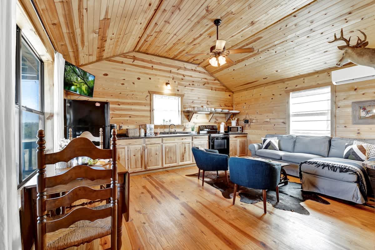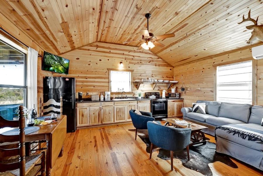 This two-bedroom cabin is ideal for a small family to stay while exploring Enchanted Rock State Natural Area or taking advantage of all that Fredericksburg offers. Each bedroom has a comfortable queen bed to provide a restful night's sleep, and the bathroom has a large walk-in shower and rustic vanity. The cabin has a full kitchen for those who want to bring groceries and cook meals.